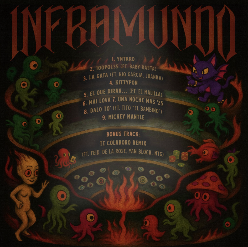 El EP ‘Inframundo’ de Brray abre con “Yntrro”, una introducción potente que hace un llamado cultural a Latinoamérica y marca el tono narrativo del proyecto. Le sigue “100POL35” junto a Baby Rasta, un himno callejero con fuerte carga sociopolítica desde Puerto Rico. “Una Gata”, con Nio García y Juanka, ofrece un reggaetón melódico sobre desamor, deseo y libertad, mientras que “Kittypon” propone un perreo minimalista y oscuro ideal para la discoteca. “El Que Dirán”, junto a El Malilla, se vuelve introspectivo, enfrentando la traición y la percepción pública. En “Mai Lova”, Brray se muestra crudo y honesto al explorar la lujuria y las relaciones complicadas. “Una Noche Más ’25” es una pieza romántica y atmosférica que mezcla la nostalgia con sonidos futuristas. El foco del EP, “Dalo To” con Tito El Bambino, es un himno electrizante que une dos generaciones del reggaetón. “Mickey Mantle” despliega estilo, seguridad y lírica afilada, mientras que “Te Colaboro Remix” cierra el proyecto con fuerza, reuniendo a grandes figuras del género urbano como Feid, De La Rose, NTG y Yan Block.